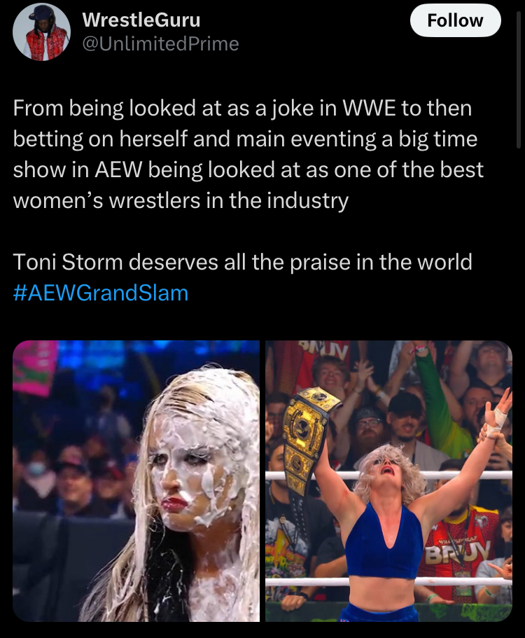 Best Female Performer of the last 1 1/2 years getting what she rightfully deserves. The Mariah arc is completed, now onwards to the next chapter in the Timeless Toni Storm story, please.