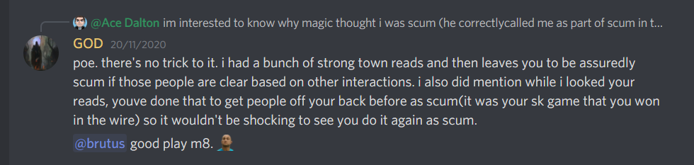 not letting man dine out on his reputation when he let something like set up spec drive his scum hunting last game