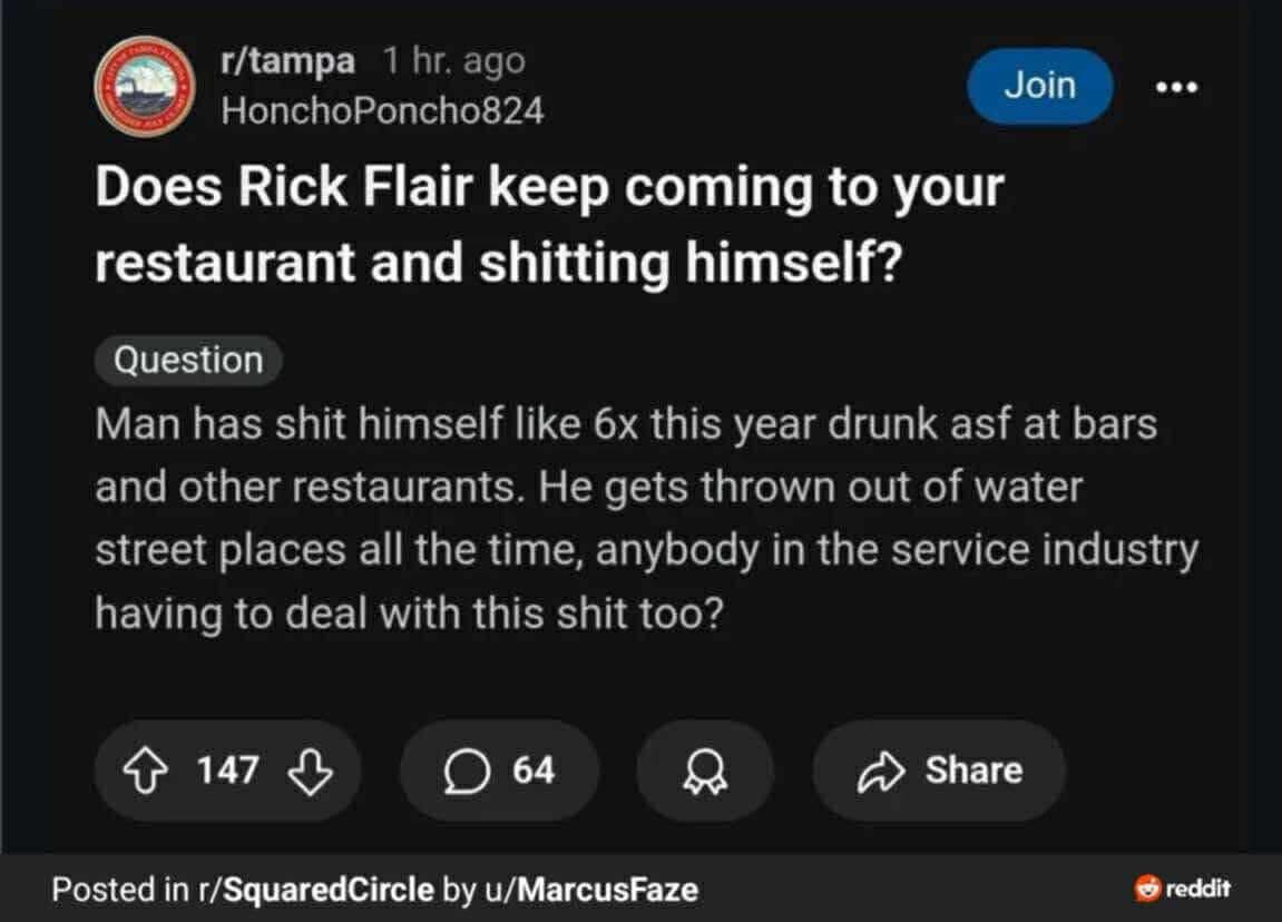 Buddy of mine who lives in Tampa posted this and confirmed a lot of his friends in the restaurant/bar industry all have Ric Flair stories.