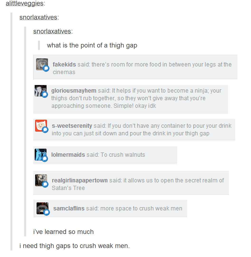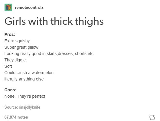 Okay, I need you both to explain the thigh thing to me. Don't me wrong, I know it means you like her thighs and it makes you horny. But give me details on why her thighs are so great. I am always willing to learn.