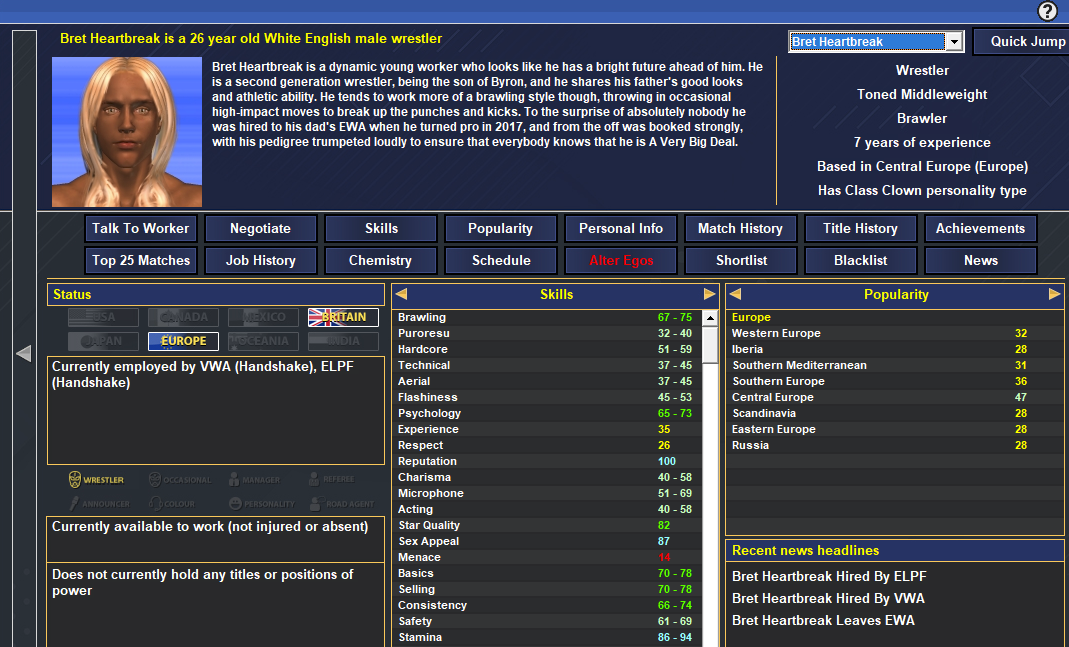 Here's another little story I've been following in my Cverse sim. So EWA which is the top European company is ran by this dude named Byron who's still wrestling in his late 40s and has now booked himself into 10 world title reigns.
