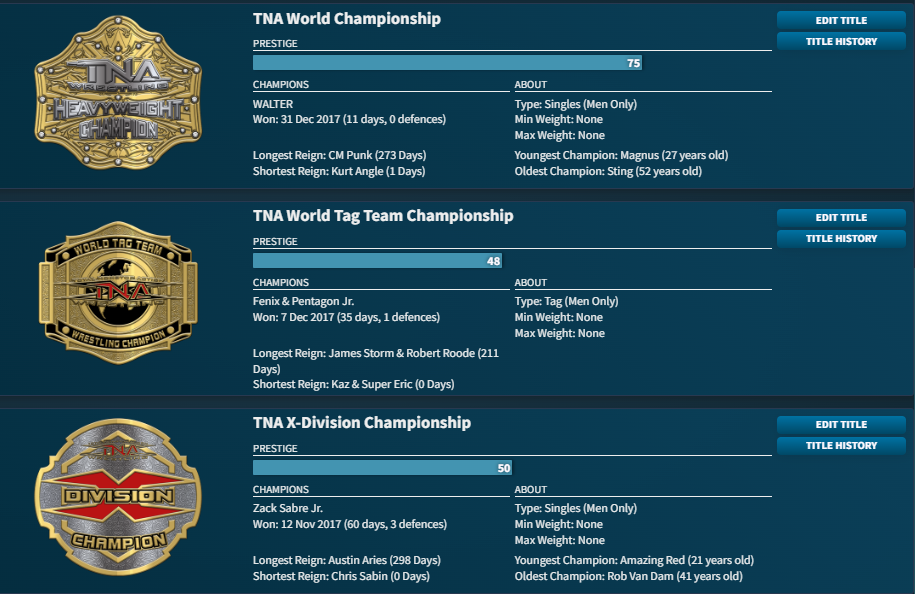 For fun, while not doing my BTB, I'm doing a 2017 TNA File in PWS. I'm aiming to have fun so I just gave myself a lot of money :heston so I can sign people lmao. Anyway here is my current champions. I'll show you the history of any title you want to see. I just got to 2018, almost been booking it a year in game. But yeah any champions you wanna see the history of, just ask.