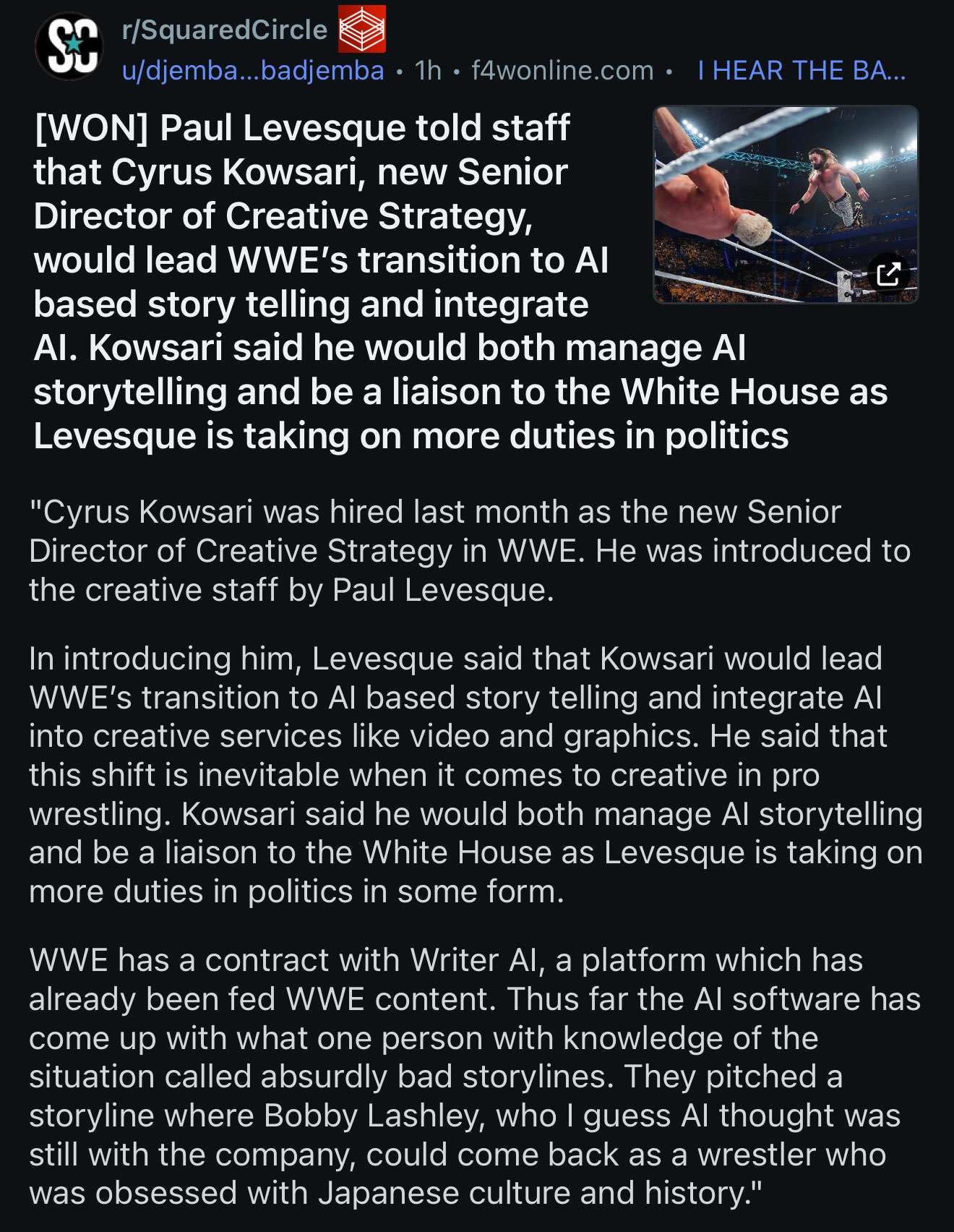 Idk what Writer AI is, but if they are feeding it stuff they have from the past to try and train it to write wrestling storylines, it's basically learning off decades of vince's ideas, which is probably why it suggested an idea for Bobby Lashley that was basically Tensai